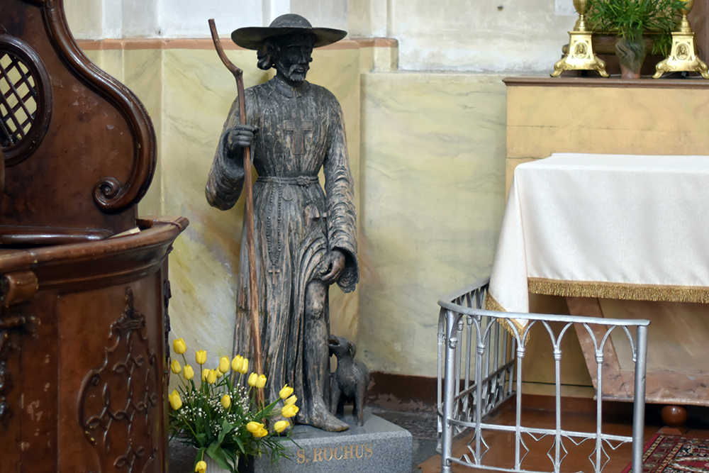 Слева от входа, под хорами стоит скульптура Святого Роха, которая когда-то возвышалась над воротами храма (сейчас там установлена копия). Св. Рох - покровитель больных чумой и холерой, а также дерматологических больных, паломников, хирургов, собак и домашнего скота. Обычно святого изображают, указывающим на чумную язву на своей левой ноге. Часто он изображается с собакой, держащей в пасти хлеб.