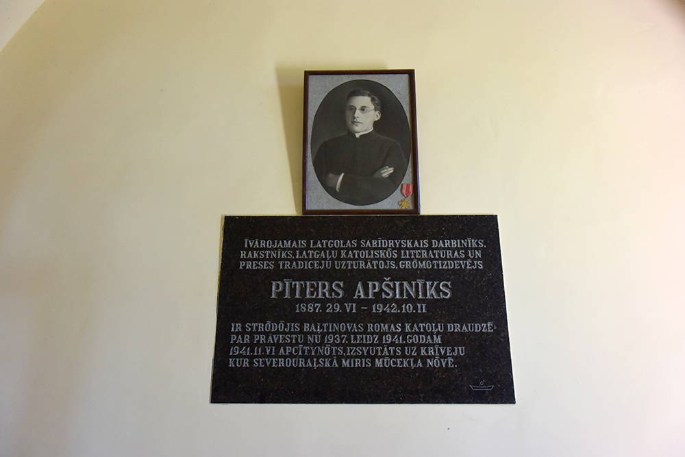 На входе в храм справа можно увидеть мемориальную табличку в память Питерса Апшиникса (Apšinīks Pīters), последнего перед оккупацией настоятеля храма. Он был арестован и депортирован в 1941 году и умер от голода в Свердловской области. Недалеко от входа на территорию костела расположен мемориал с воинским захоронением времен Второй мировой войны.
