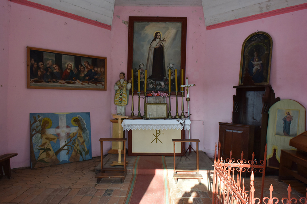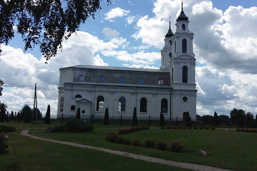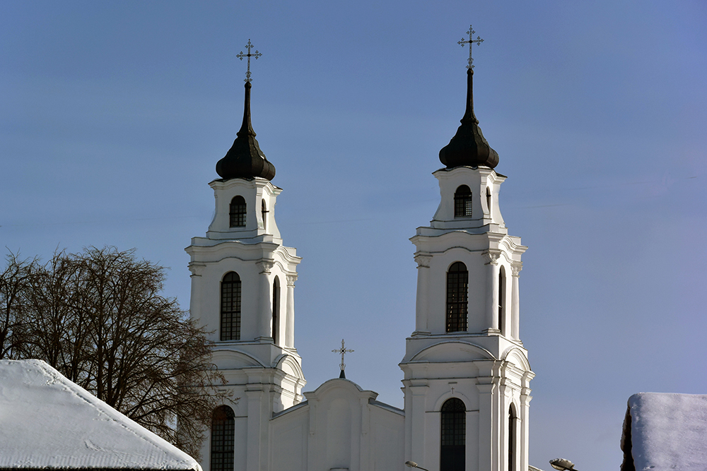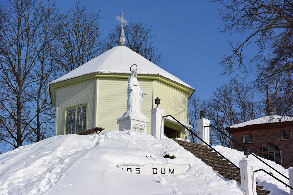 По дороге к храму, слева возвышается небольшая семейная часовня (каплица) польских помещиков Карницких. Это деревянное здание с крышей в форме конуса и крестом построено в 1738 году, одновременно со сгоревшим впоследствии костелом. После пожара часовня какое-то время служила молельней для местных католиков. А рядом с часовней находится та самая колокольня, которой также удалось избежать пожара.