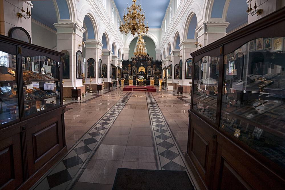 В соборе установлен трёхъярусный дубовый иконостас. Главный алтарь, как и положено по посвящению храма, освящён во имя благоверных князей Бориса и Глеба. Правый престол - во имя святого Алексия, митрополита Московского, левый - во имя Успения Пресвятой Богородицы. Иконы являются копиями работ В. М. Васнецова в Киевском Владимирском соборе. Говорят, когда-то и стены собора украшали фрески – "копии васнецовского письма", но они были закрашены. "Сдержанный стиль интерьера поразительно контрастирует с обильным и праздничным наружным декором – порталами, наличниками, аркадами, пилястрами, колоннами", - писал в своей книге Леон Тайван.