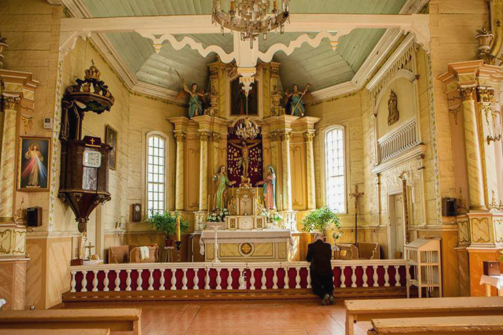 Деревянная католическая церковь была заложена здесь в 1741 году по заказу владельца Малнавского поместья графа Шадурского. В интерьере сохранились памятники декоративного искусства - три алтаря и деревянная кафедра, построенная в 1760 г. Здешние места всегда оставались преимущественно католическими, и со временем, церковь стала маловата для большого числа прихожан. В период первой независимости Латвии было решено построить новый каменный храм, а старый перенести в одно из окрестных сёл.
