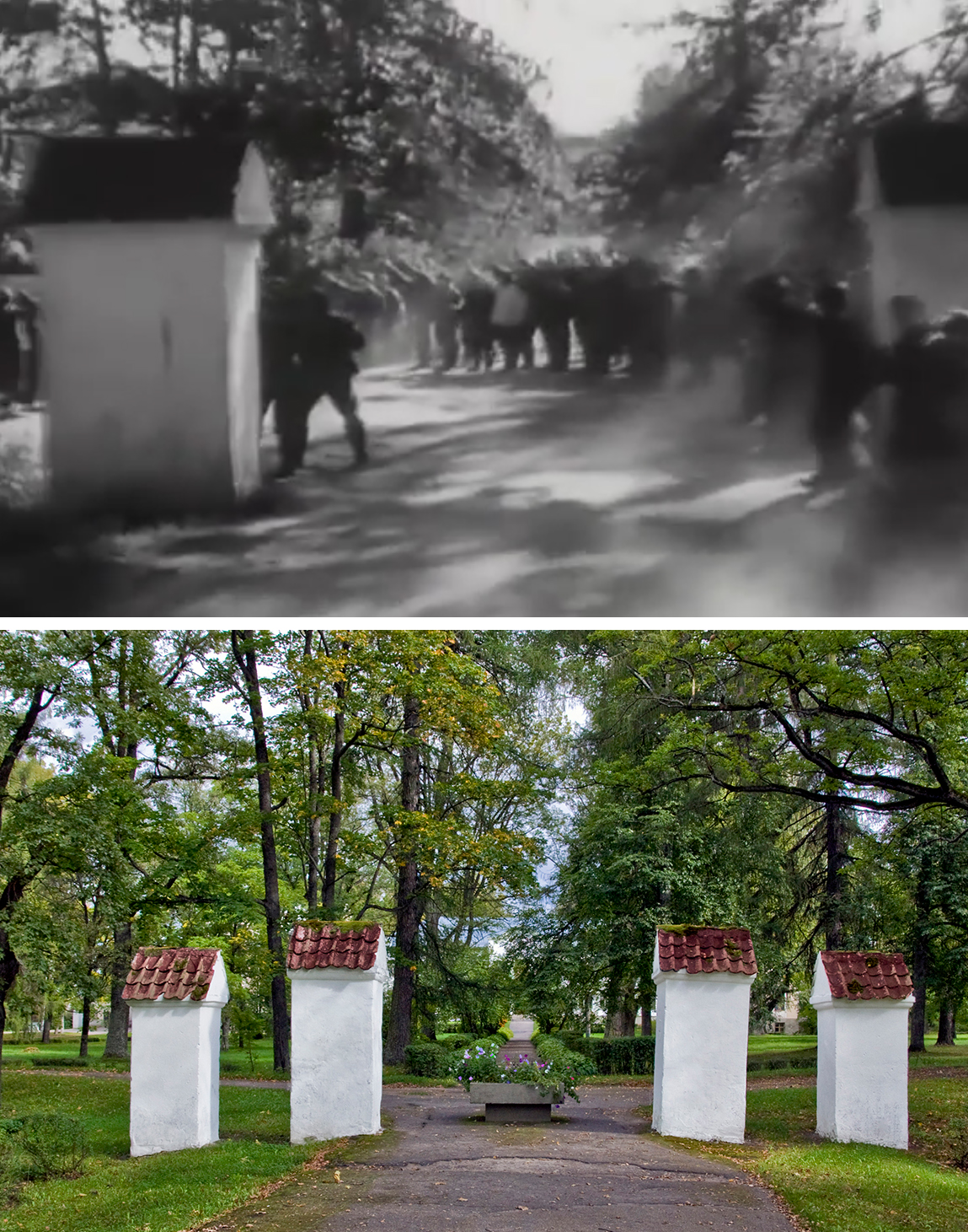 В исторической хронике действительно можно увидеть детали, намекающие на Малнавское поместье. В кадре встречи кортежа Гитлера хорошо видны характерной формы въездные башенки ворот имения.