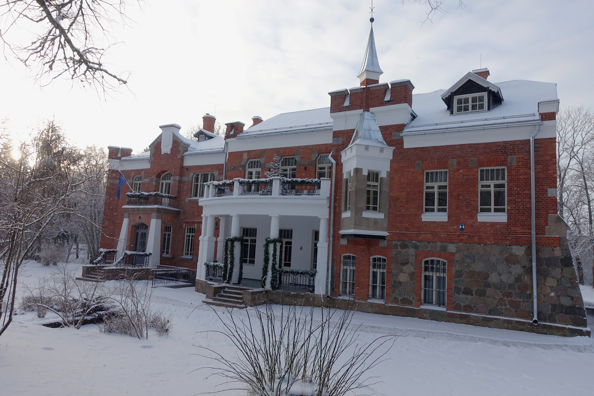 Профессор купил имение за 80 000 рублей – исключительно крупная сумма по тем временам (подробнее о нем можно прочесть в блоге rezeknenka. Так называемый Красный дом, единственная сохранившаяся капитальная постройка, возводилась в 1905-1911 гг. под руководством зятя Кербедза (сам генерал скончался в 1899 году). Владельцы называли здание из полевого камня и красного кирпича, украшенное башенками со шпилями, Новым дворцом.