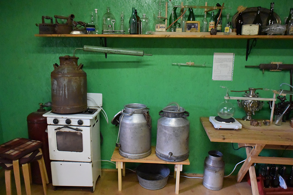 Как всегда, в экспозиции народные самогонные аппараты, посуда для хранения и распития. Но кроме того: действующая установка с моментальным получением напитка, а также интересный рассказ хозяина с забавными деталями. Ну и неизменная дегустация в конце (особо рекомендуем брусничную настойку – волшебно!).